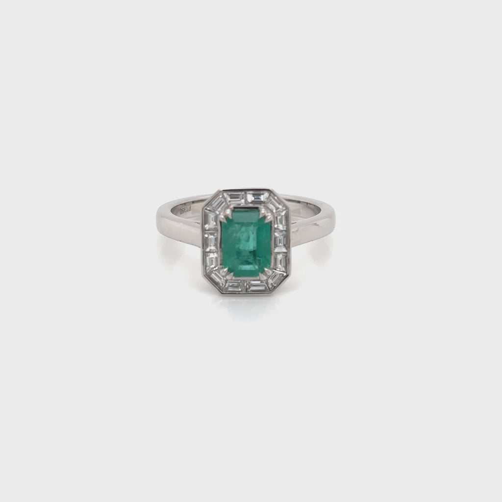 This sophisticated platinum ring showcases a striking octagonal emerald as its centrepiece, complemented by precisely set baguette diamonds that frame the stone with geometric elegance. The emerald's rich, verdant hue creates a captivating focal point, while the baguette diamonds enhance its brilliance through their linear arrangement. Crafted in platinum for exceptional durability and a lustrous white finish, this piece combines timeless design with refined craftsmanship. Ideal for those who appreciate distinctive gemstone jewellery with understated luxury and architectural precision.