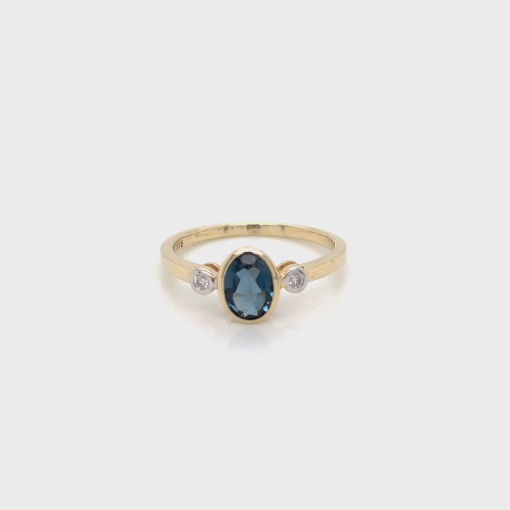 Crafted in 9ct yellow gold, this sophisticated ring showcases a striking London blue topaz complemented by sparkling diamonds. The deep, cool tones of the London blue stone create an elegant contrast against the warm lustre of the gold setting, while the diamond accents enhance its refined appeal. A timeless piece that combines gemstone beauty with expert craftsmanship, perfect for those who appreciate distinctive jewellery with character and quality.